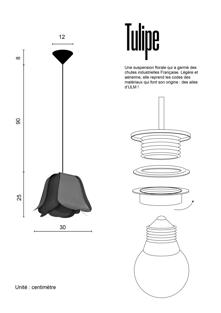 La suspension Tulipe s’installe comme un plafonnier. Elle est vendue avec son système électrique, noir ou blanc, ampoule non incluse.